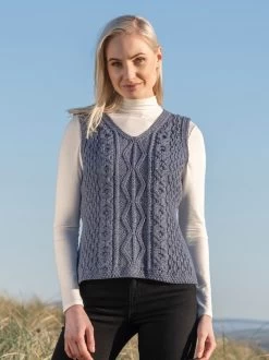 This Irish Aran Sleeveless Vest is made of 100% Merino Wool. It is perfect for layering over your best Irish sweater for the colder days or over a lighter top for the milder days ahead. It is slightly longer at the back so it is really flattering on and the charcoal colour makes this style even more slimming. Hand wash or dry clean.