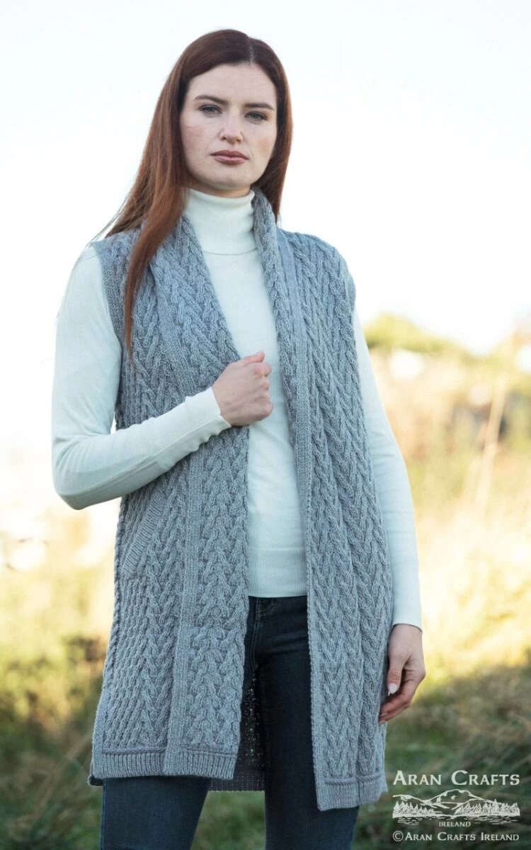 Made in Westport, Ireland, this stunning sleeveless cardigan is made of 100% Merino Wool. With a beautiful herringbone stitch throughout and pockets for ease it is a beautiful summer cardigan.