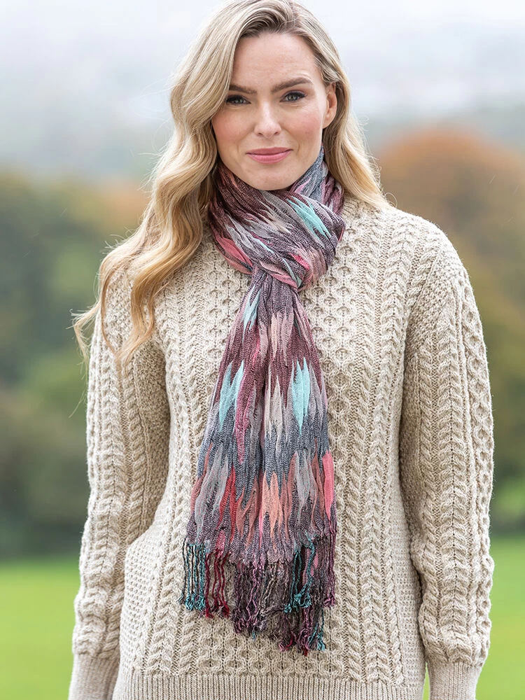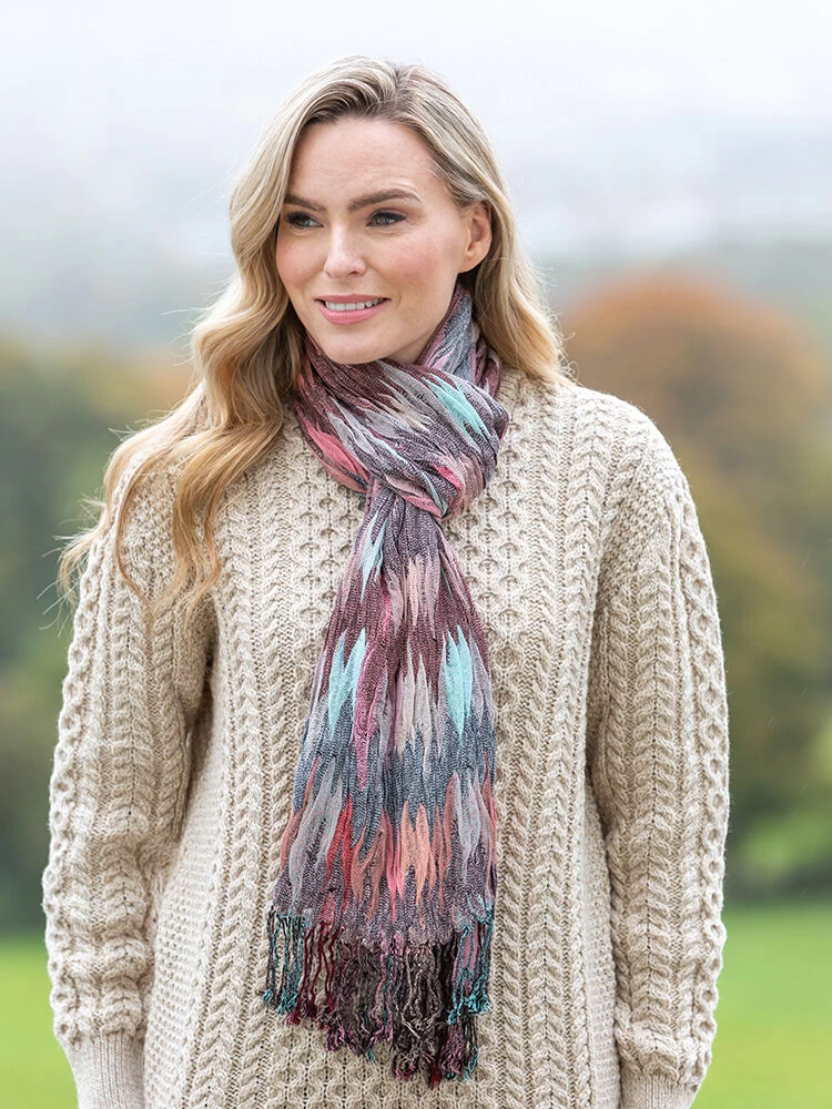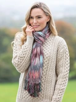 This beautiful Irish scarf is extreemely soft and is a mixture of soft grey and pinks throughout. This scarf is a perfect pop of color to add to any outfit. Made of viscose – this Irish scarf is soft and luxurious and the perfect stocking filler this year!