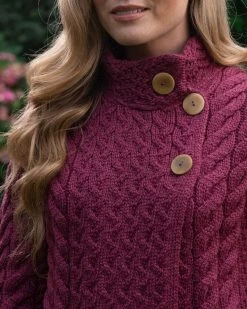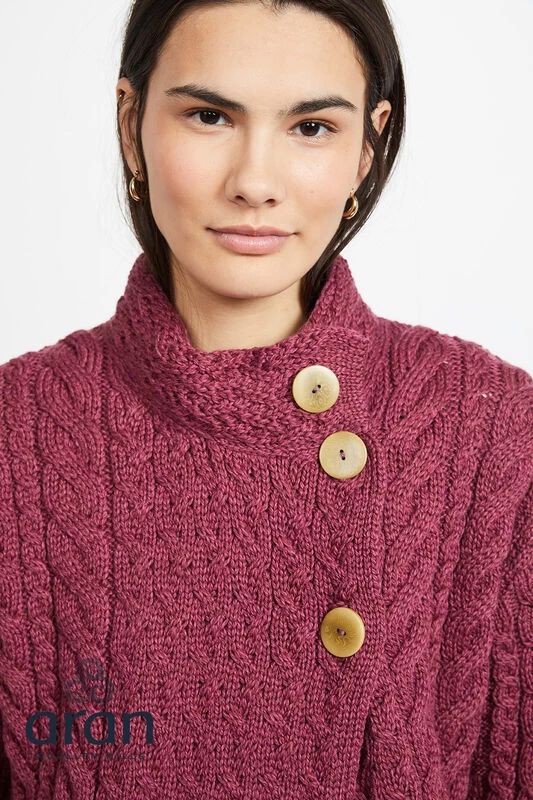 This ladies super soft 3 button aran sweater is made in Westport. Co.Mayo of 100% Super soft Merino Wool. It is so luxurious you will never want to take it off. The rose color makes each and every stitch pop and will keep compliments coming your way. Wear open as a cardigan or close over for the colder evenings and show off the style. Team with your favourite jeans and Irish scarf.