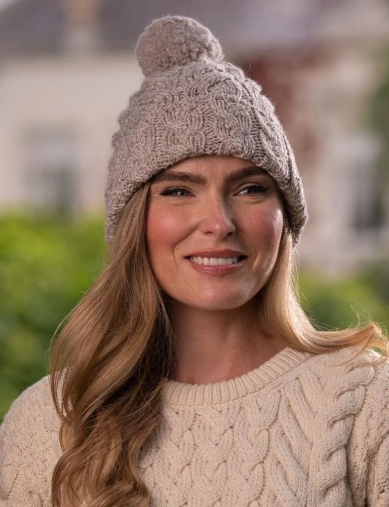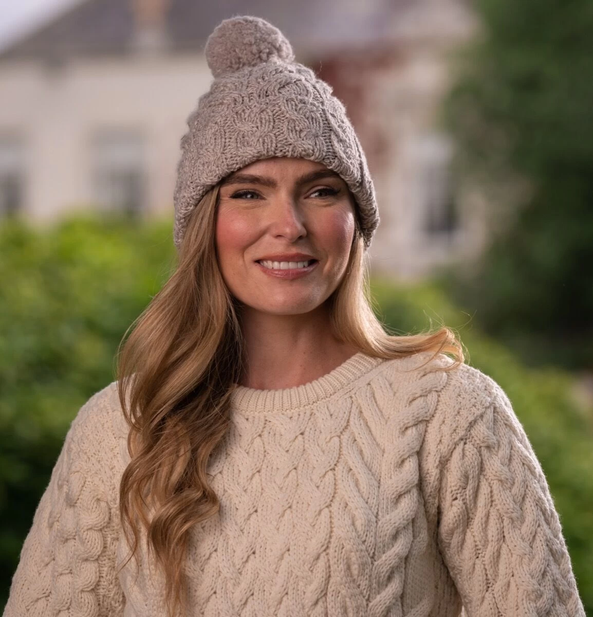 This beautiful beige cable knit hat with pom pom is a perfect Irish accessory to wrap up in – made with super soft merino wool it will keep you cosy all day long.Pair it with a cardigan or a sweaters and be winter ready.