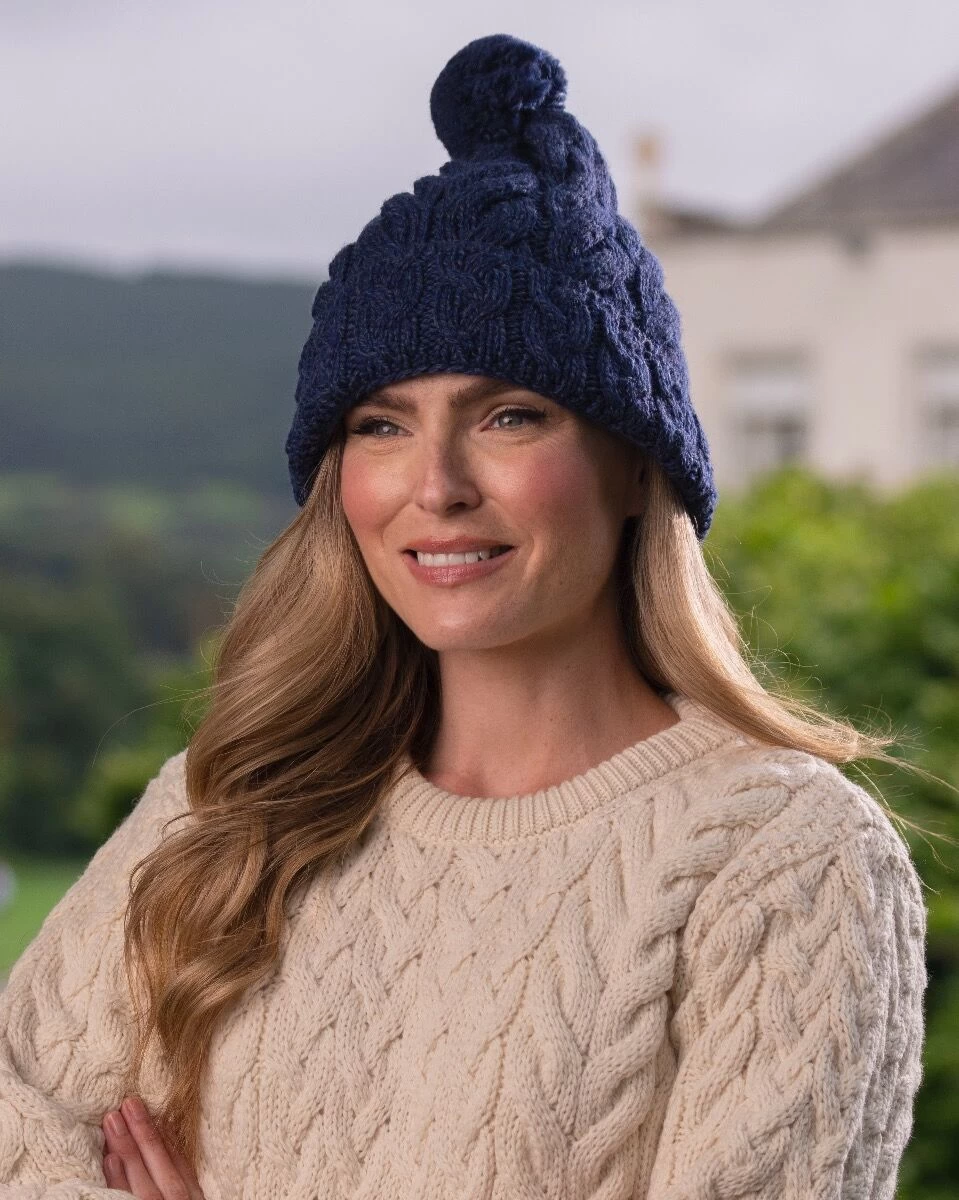 This beautiful navy cable knit hat with pom pom is a perfect Irish accessory to wrap up in – made with super soft merino wool it will keep you cosy all day long.Pair it with a cardigan or a sweater and be winter ready.