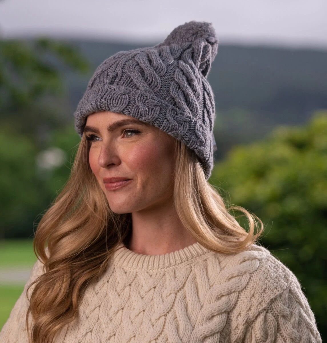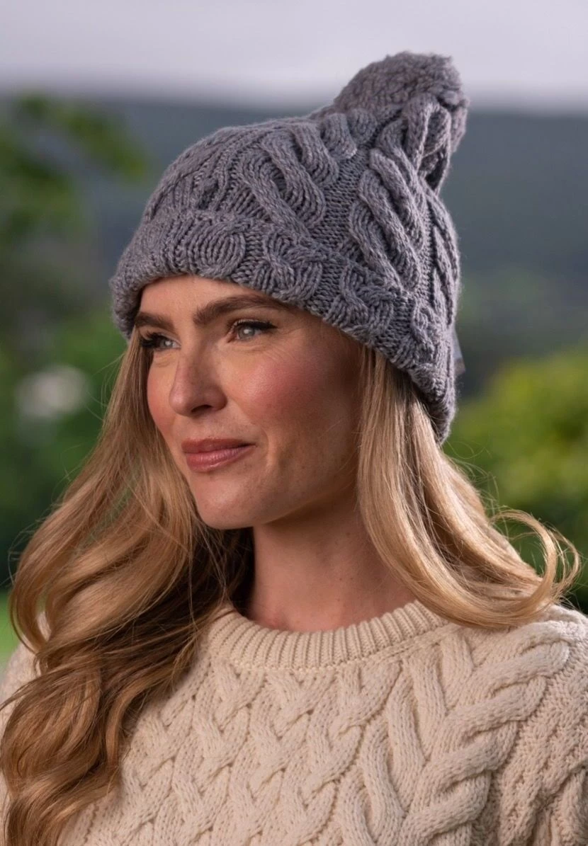 This beautiful silver cable knit hat with pom pom is a perfect Irish accessory to wrap up in – made with super soft merino wool it will keep you cosy all day long.Pair it with a cardigan or a sweaters and be winter ready.