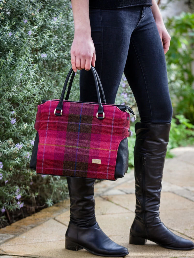 This vibrant pink Emily bag is a beautiful addition to any wardrobe. It features a check pattern with bright yellow and purple stripes and secure zipped pockets and fastening. While it has short straps attached, it also comes with a long strap if you prefer a cross-body purse.