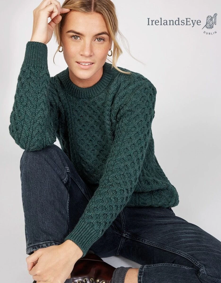 This gorgeous Irish Aran sweater, available in a selection of colours is made in Ireland by traditional crafting families using 100% Pure Merino Wool. The stunning shade of evergreen is a new yarn in a beautiful shade of green.