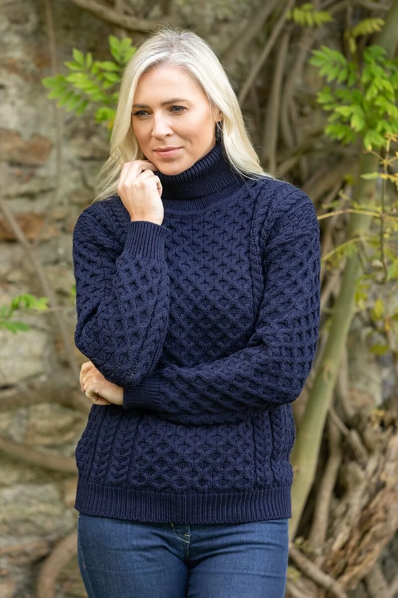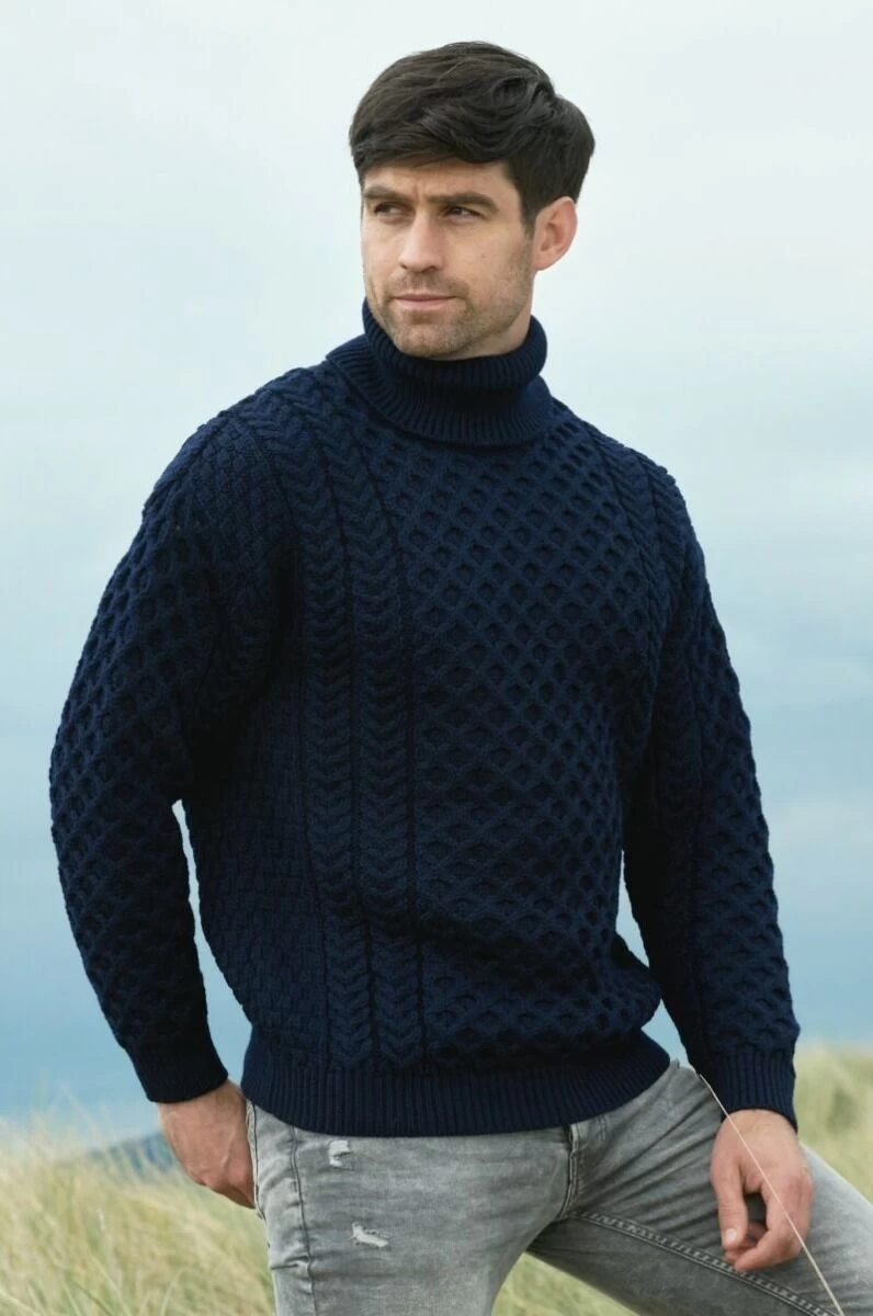 This Irish Aran turtleneck, available in natural and charcoal, is made in Ireland and is 100% Soft Merino Wool. It can be worn by both women and men and will keep you warm throughout the cold winter days. This Aran jumper wonderfully combines functionality and warmth, resulting in a stylish yet hard wearing classic that will last for years. It follows all the Traditional Irish stitching patterns that have been passed down from generation to generation, which in olden days told stories of families and life in Ireland. This jumper tells an Irish story through knitting.