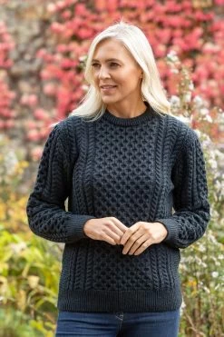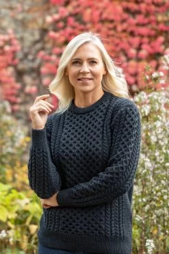 This unisex Aran Sweater is made of 100% Merino Wool. This stunning shade is called Blackwatch, which is a mix of navy and green together – giving the most beautiful colour. It goes perfectly with blue jeans and your favourite boots. Featuring an array of Irish stitches throughout, this sweater is one that will last a lifetime and keep you warm in the mean time! Handwash or dry clean only.