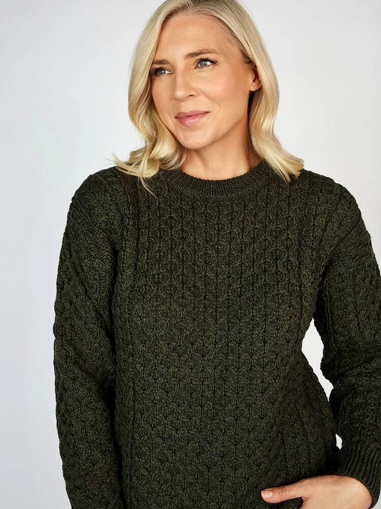 Along the centre panel of the body the honeycomb Aran stitch flows, signifying the hard working bee or the hard work of a fisherman. On either side of this centre panelling there are rows of Irish cable Aran stitches resembling the fishermans ropes, the link to life. This unisex aran sweater tells a story through Irish stitches. This aran crew neck sweater is available in extra small and XXL, and can be worn by men and women.