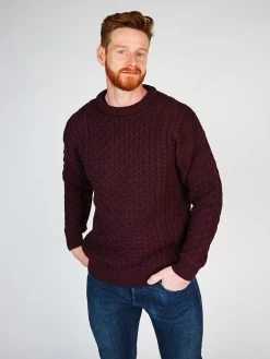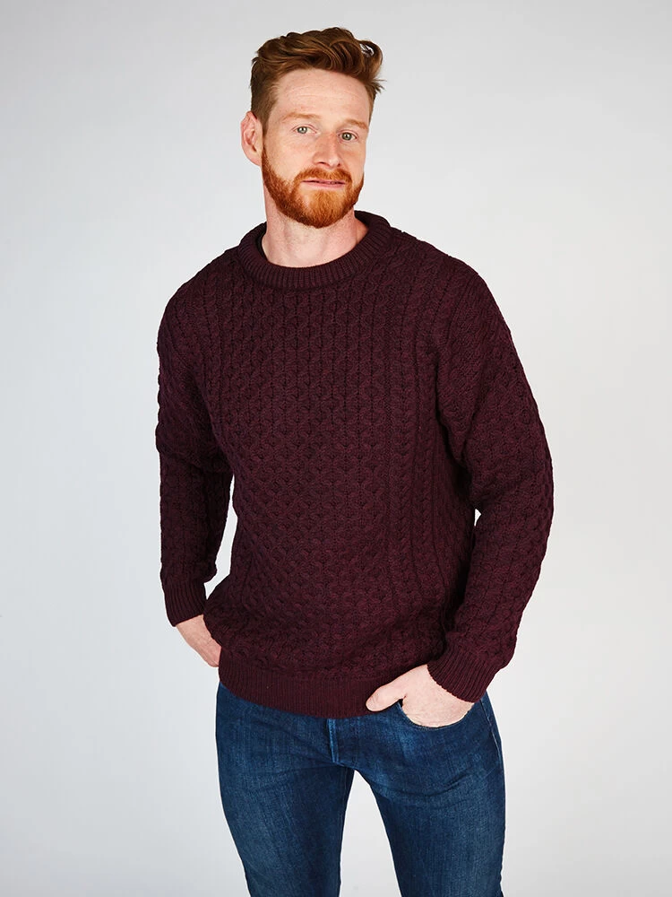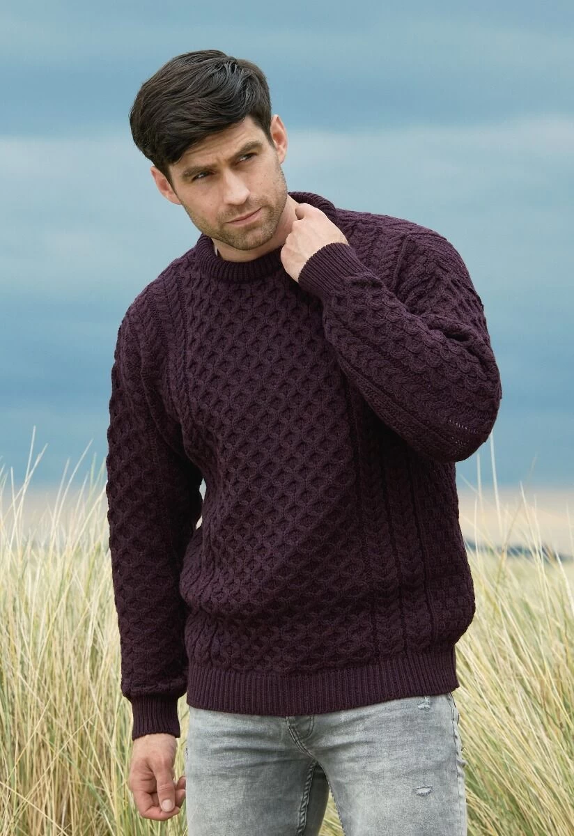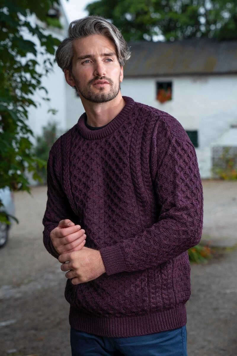 This classic unisex Irish crew neck sweater is made in Ireland of 100% merino wool. It follows all the Traditional Irish Aran stitching patterns that have been passed down from generation, which in past told stories of families and life in Ireland. It is a stunning shade of purple called damson, making the stitches really pop.