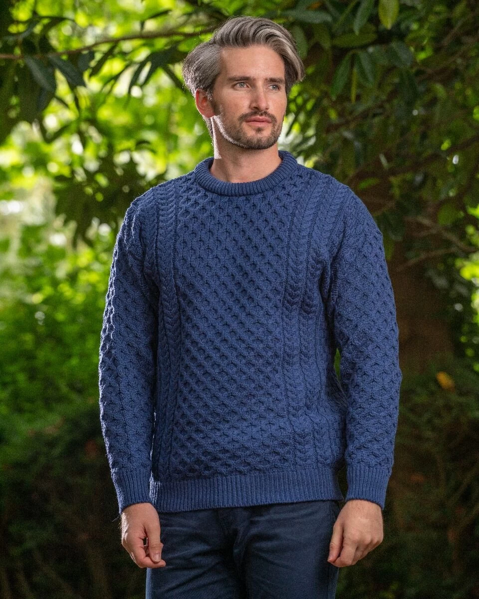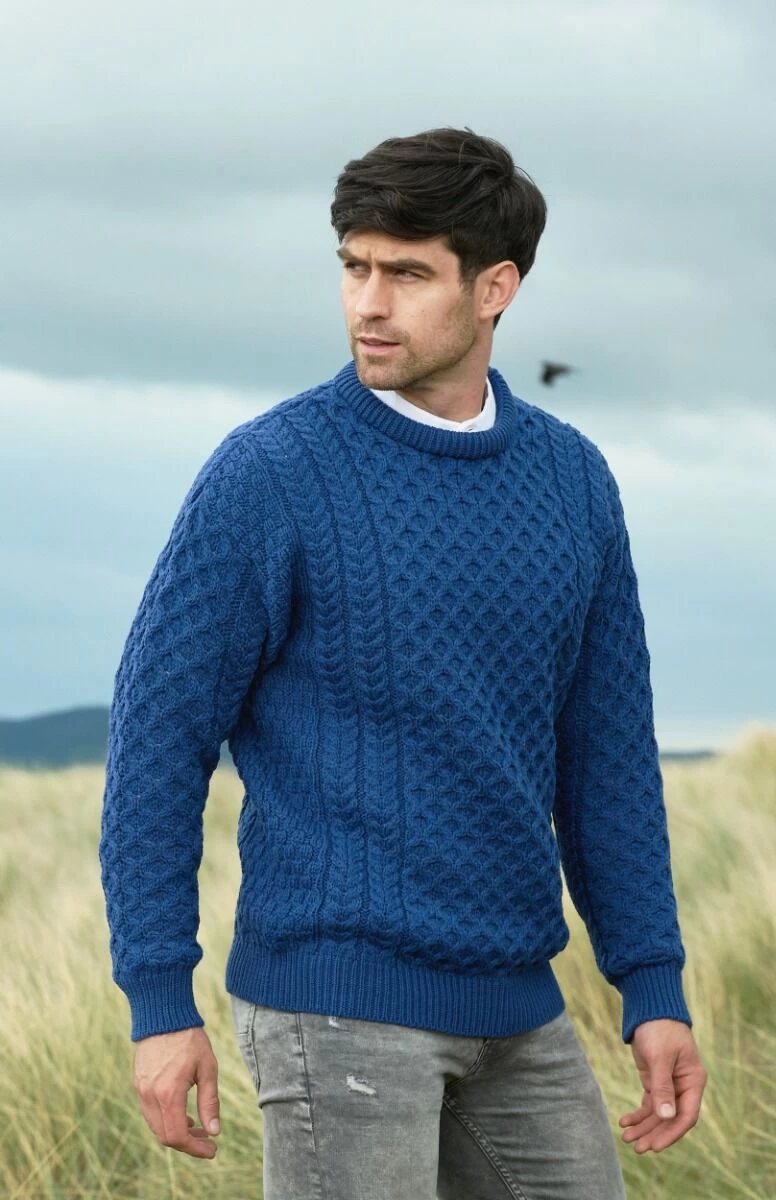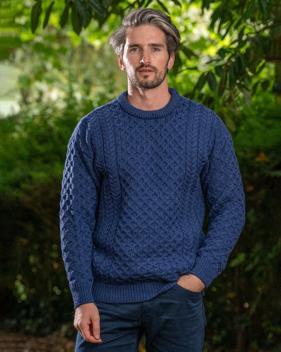 This classic unisex Irish crew neck sweater is made in Ireland of 100% merino wool. It follows all the Traditional Irish Aran stitching patterns that have been passed down from generation, which in past told stories of families and life in Ireland. It is a stunning shade of Blue called Denim Blue, making the stitches really pop.