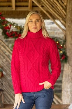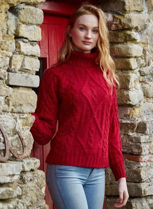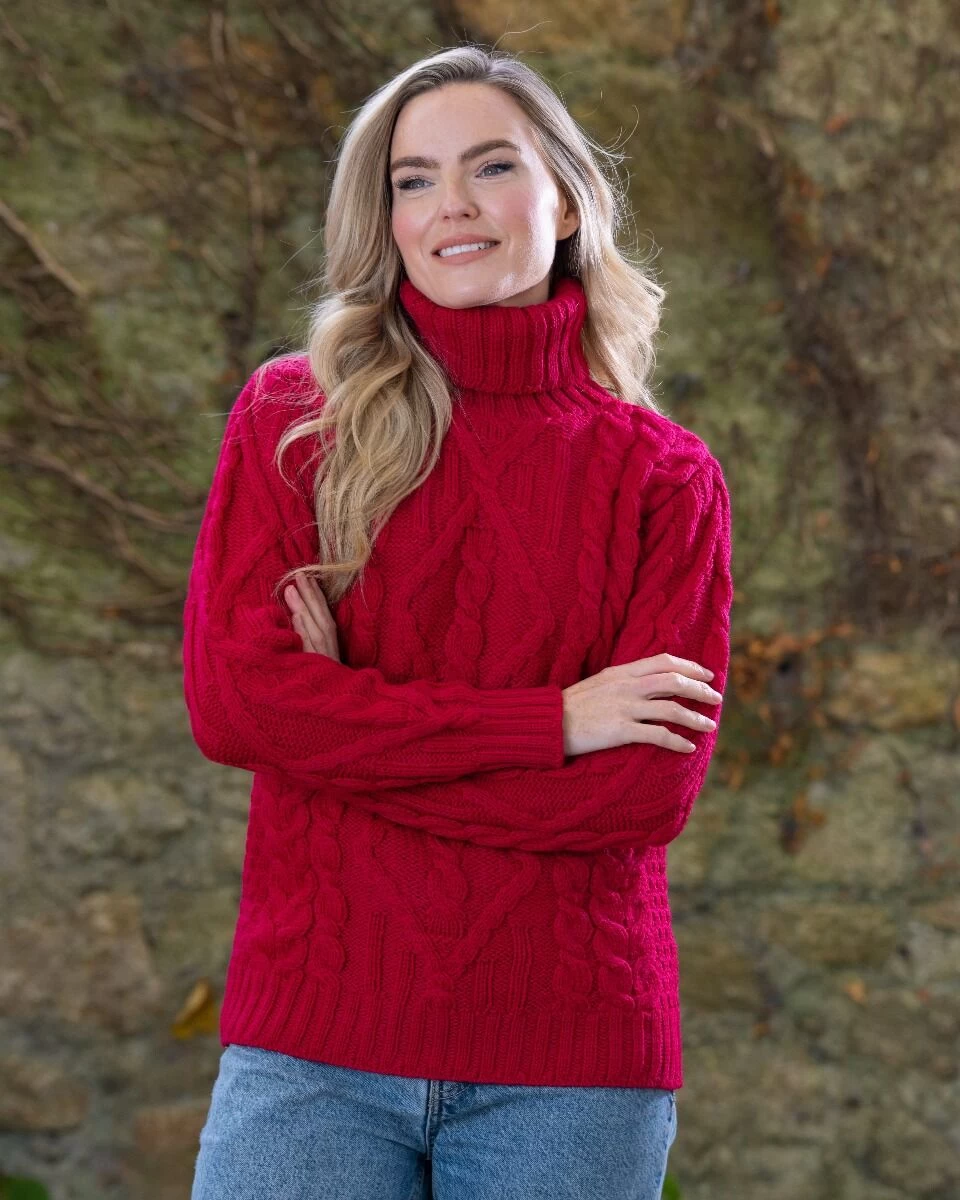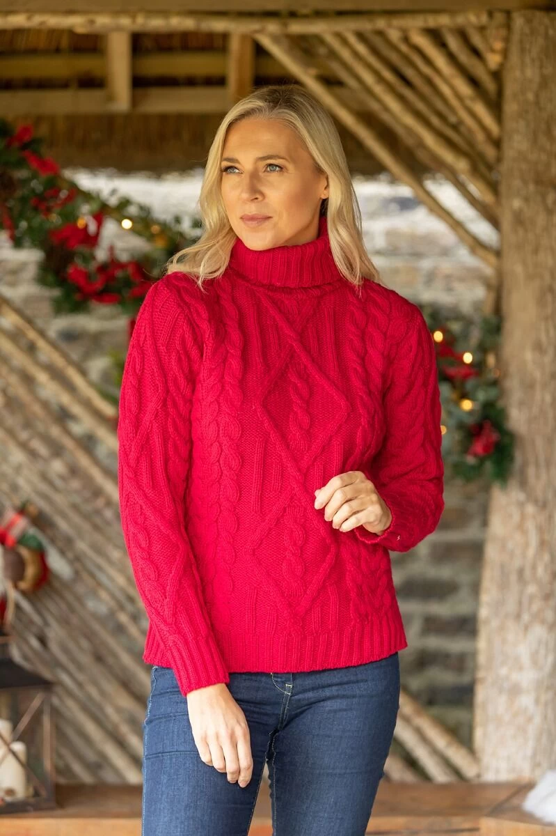 This women’s turtleneck cable Irish knit sweater is available in red and naturally white is made in Ireland and is 100% Soft Merino Wool. Its traditional cabling and flattering fit allows for it to be paired with any combination of outfit. Team with dark denim jeans, a skirt or leather trousers to complete the fully authentic look. This women’s Irish sweater is both soft to the touch as well as incredibly eye-catching.