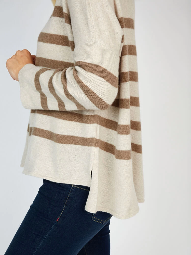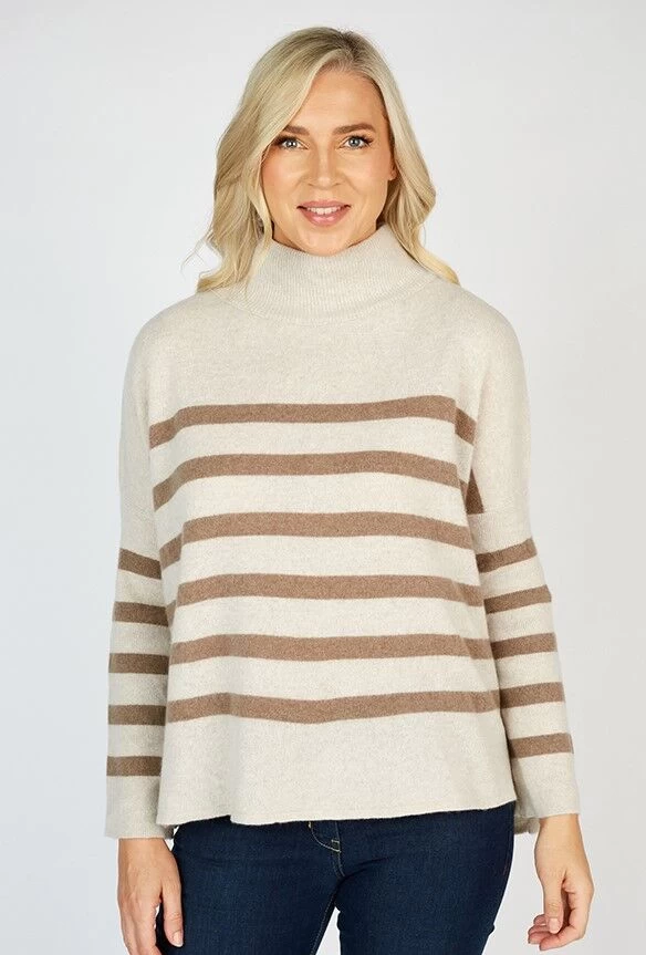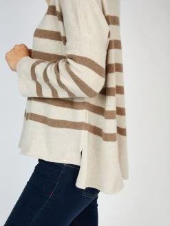The ultimate luxury sweater – this one size poncho style sweater is made of 90% ultrafine merino wool and 10% cashmere.It has a dipped hem at the back and beautiful beige and brown stripe design. A classic style sweater that is luxurious and will never date.